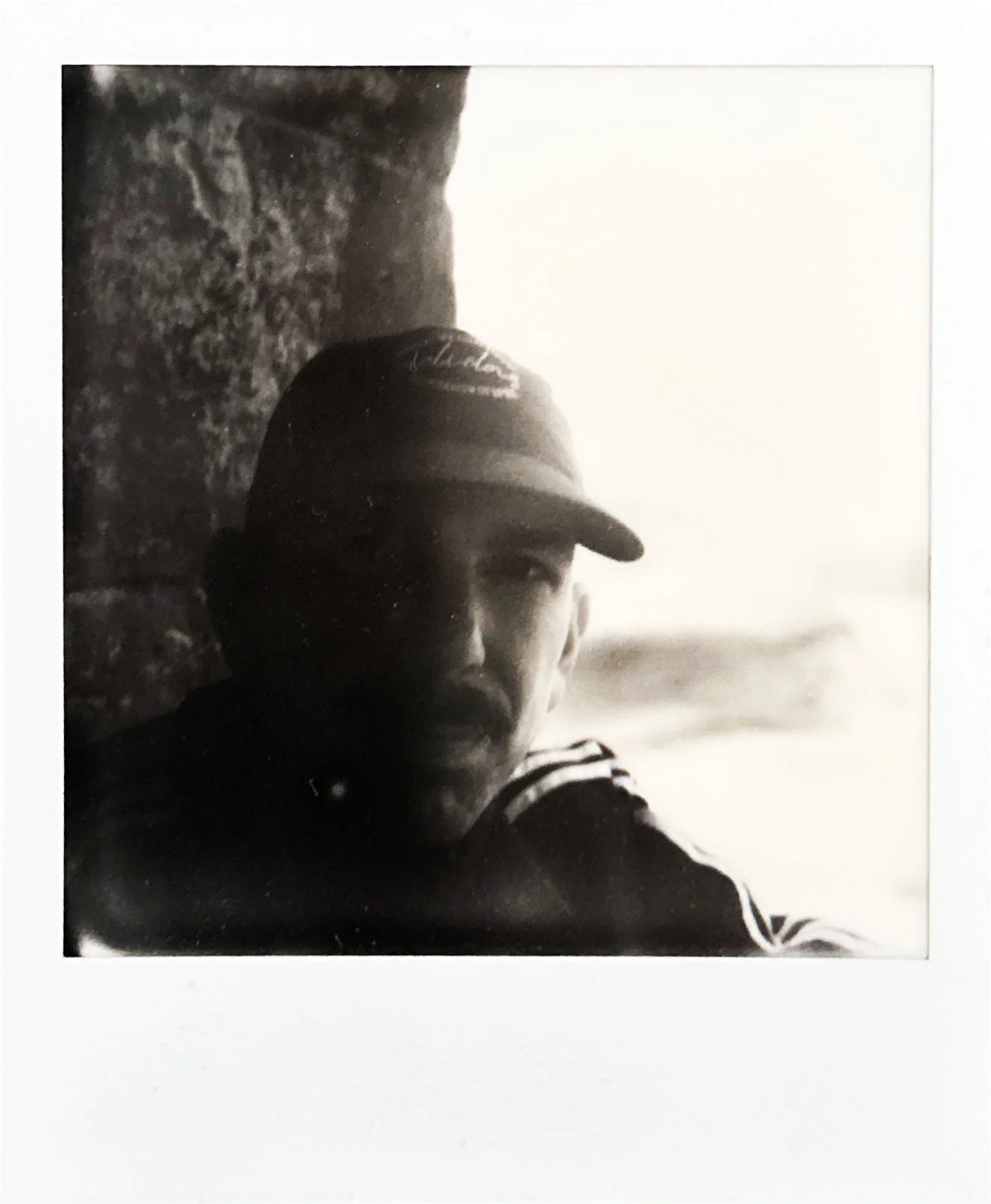 A black and white photo of a young man with short hair, smiling and standing shirtless indoors near a doorway.